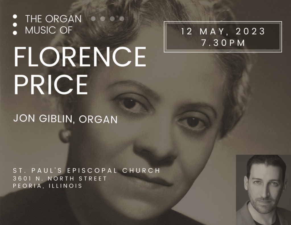 On Friday, May 12th at 7:30 p.m., Dr. Jon Giblin will present an organ recital on the music of Florence Price at St. Paul’s Episcopal Church in Peoria.